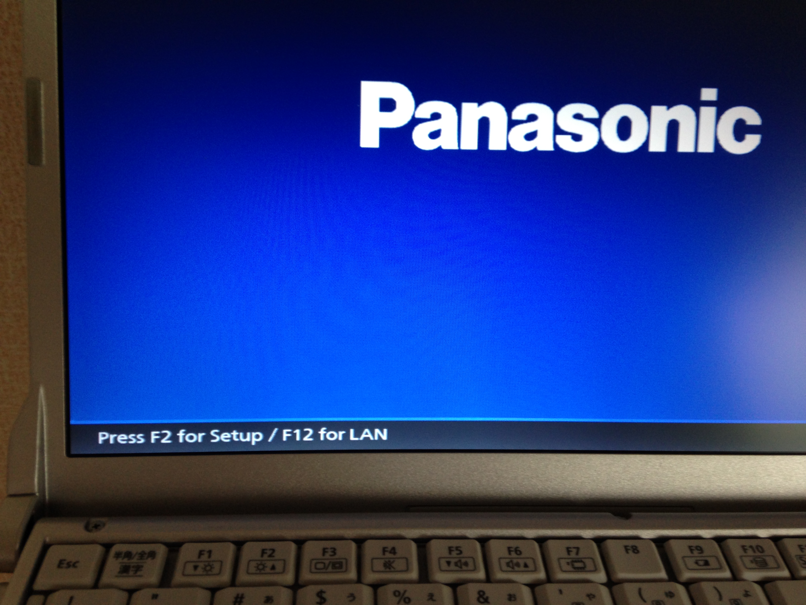 BIOS の設定を変更する方法は、パソコンに電源を入れたすぐあとにキーボードの F2 ボタンを押します。↑ の写真に Press F2 for Setup と表示されているのがわかると思いますが、これが BIOS の設定画面に入るための操作になります。この Let’s note の場合は F2 ボタンですが、他のパソコンだと F2 でないこともあります。いずれにしてもパソコンに電源を投入してすぐに同じような文字が表示されるのでそれで F2 なのか、それ以外なのかを確認していけば良いです。