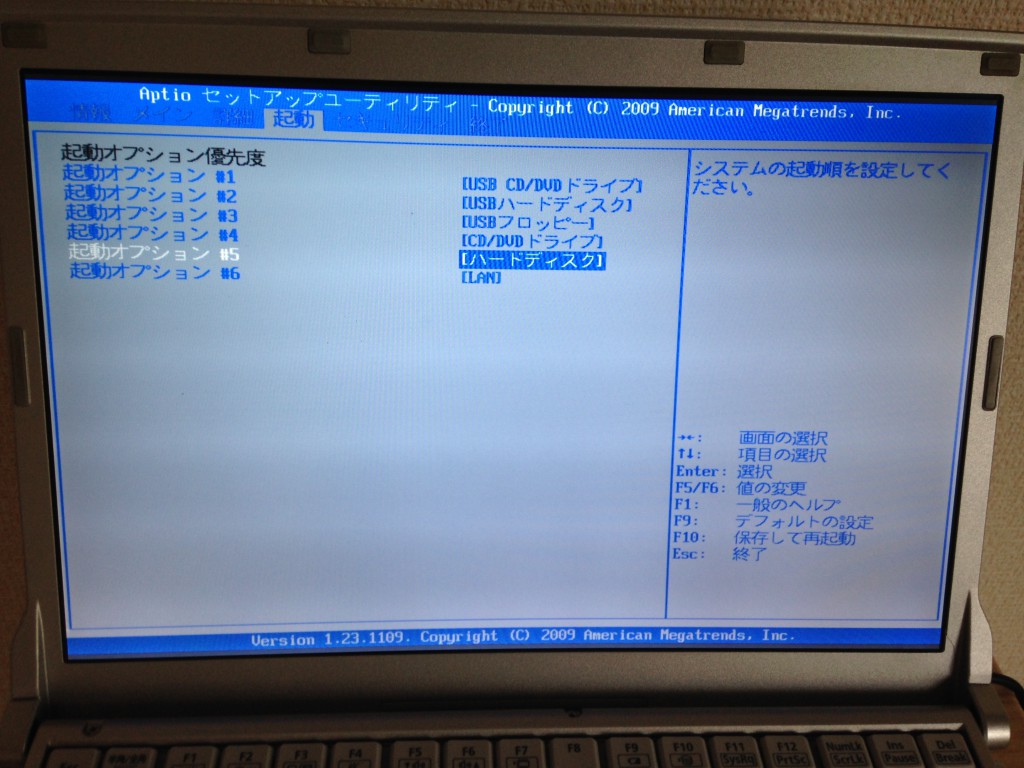 起動オプション #1 からはじまって、起動オプション #6 まで表示されています。つまり、パソコン起動時にどこから OS を呼びこむか?の選択肢が6個あることになります。キモは、「ハードディスク」の優先度合いを下げることですので下にさげていきます。写真では起動オプション #5 まで下げられています。その上には、